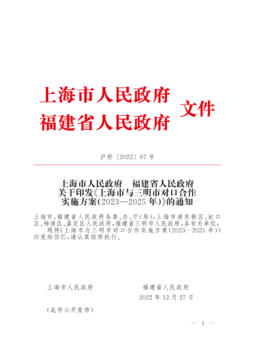 上海市人民政府福建省人民政府关于印发《上海市与三明市对口合作实施方案(2023—2025年)》的通知