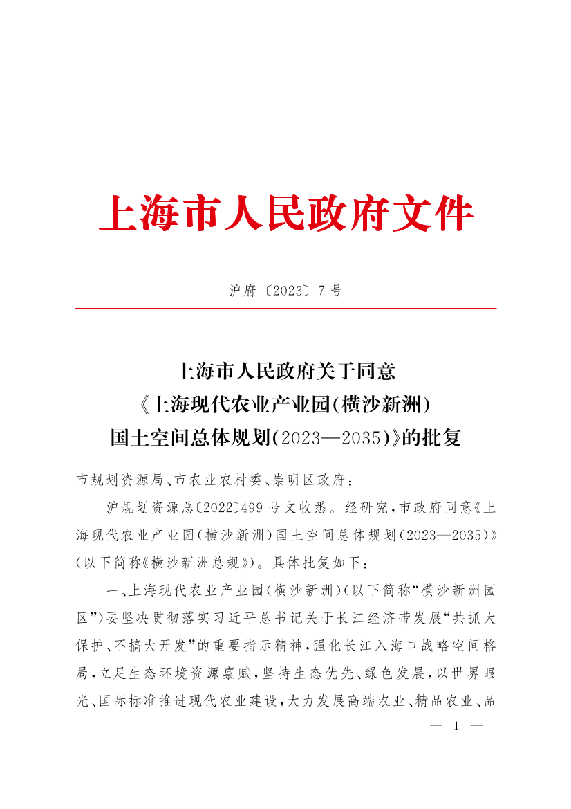 沪规划资源总〔2022〕499号文收悉。经研究,市政府同意《上海现代农业产业园(横沙新洲)国土空间总体规划(2023—2035)》(以下简称《横沙新洲总规》)。具体批复如下: