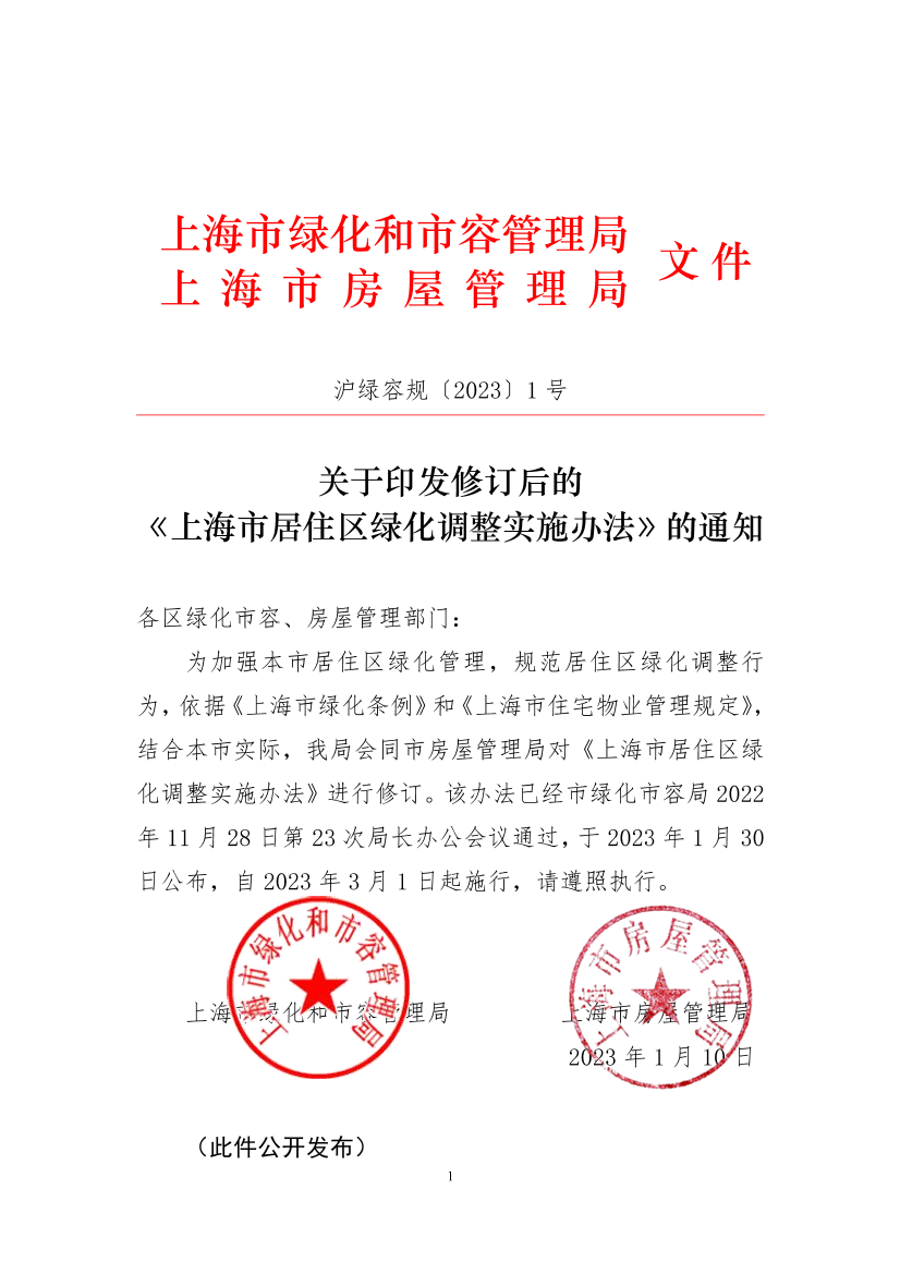 为加强本市居住区绿化管理,规范居住区绿化调整行为,依据《上海市绿化条例》和《上海市住宅物业管理规定》,结合本市实际,我局会同市房屋管理局对《上海市居住区绿化调整实施办法》进行修订。该办法已经市绿化市容局2022年11月28日第23次局长办公会议通过,于2023年1月30日公布,自2023年3月1日起施行,请遵照执行。