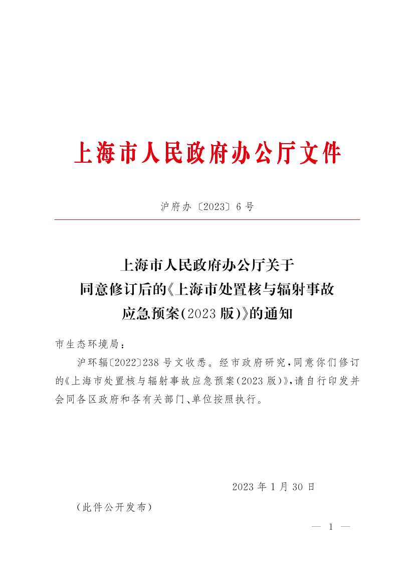 上海市人民政府办公厅关于同意修订后的《上海市处置核与辐射事故应急预案(2023版)》的通知