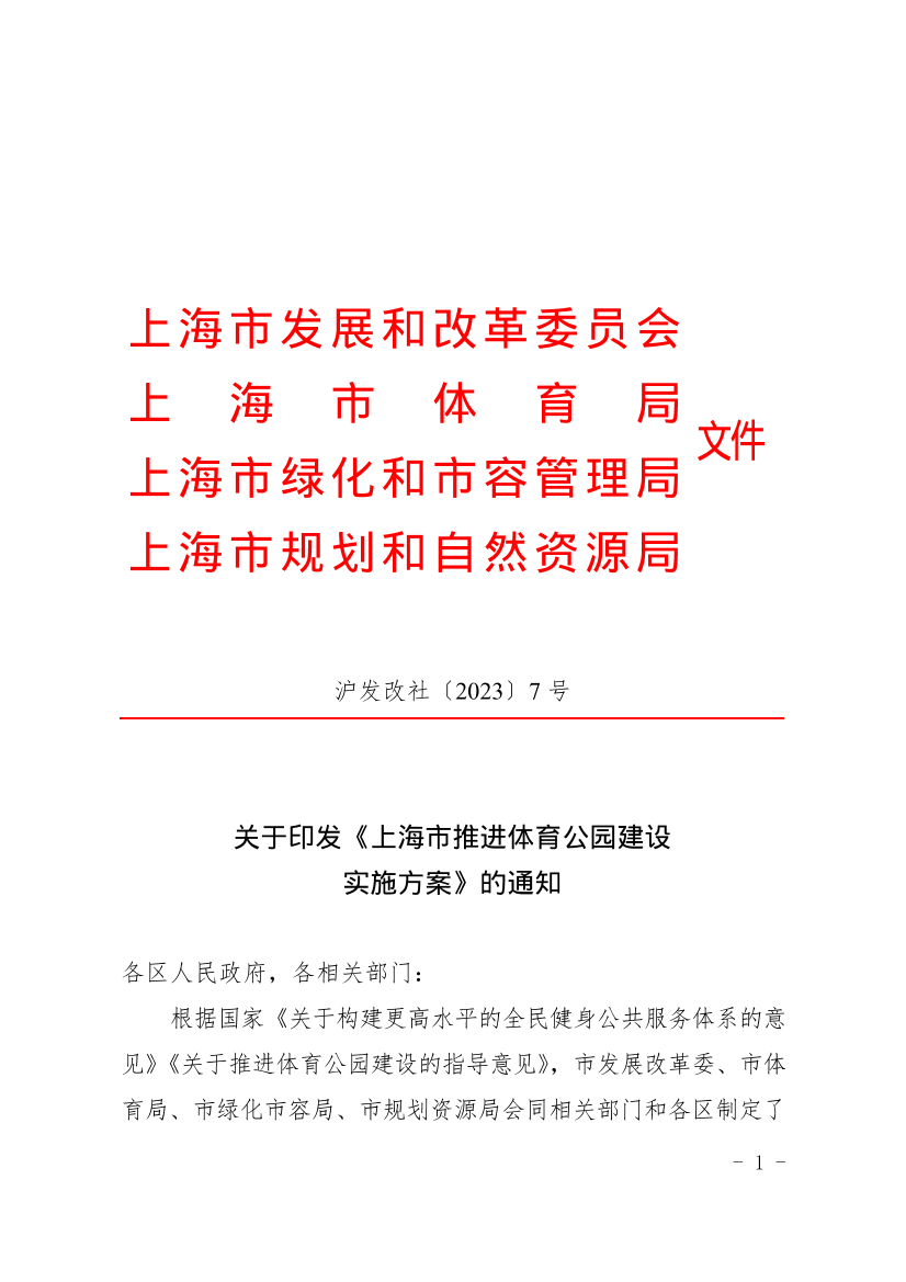 关于印发《上海市推进体育公园建设实施方案》的通知