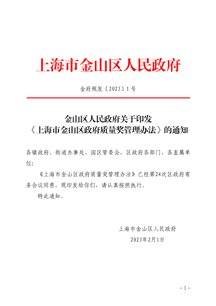 金山区人民政府关于印发《上海市金山区政府质量奖管理办法》的通知