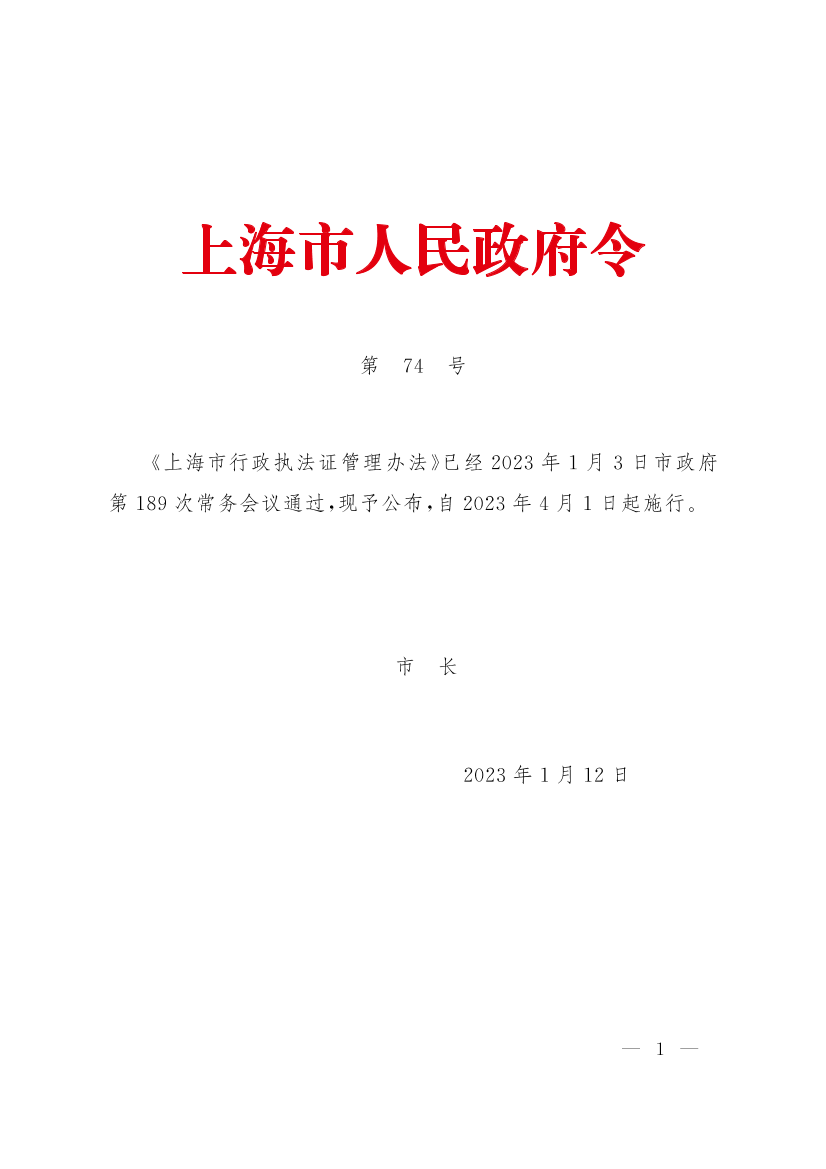 《上海市行政执法证管理办法》已经2023年1月3日市政府第189次常务会议通过,现予公布,自2023年4月1日起施行。