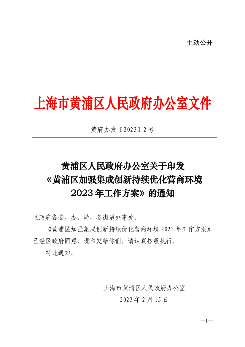 黄浦区人民政府办公室关于印发《黄浦区加强集成创新持续优化营商环境2023年工作方案》的通知
