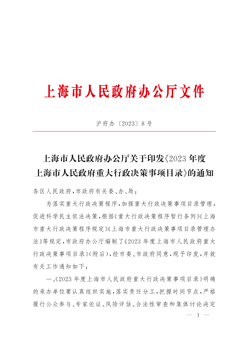 上海市人民政府办公厅关于印发《2023年度上海市人民政府重大行政决策事项目录》的通知