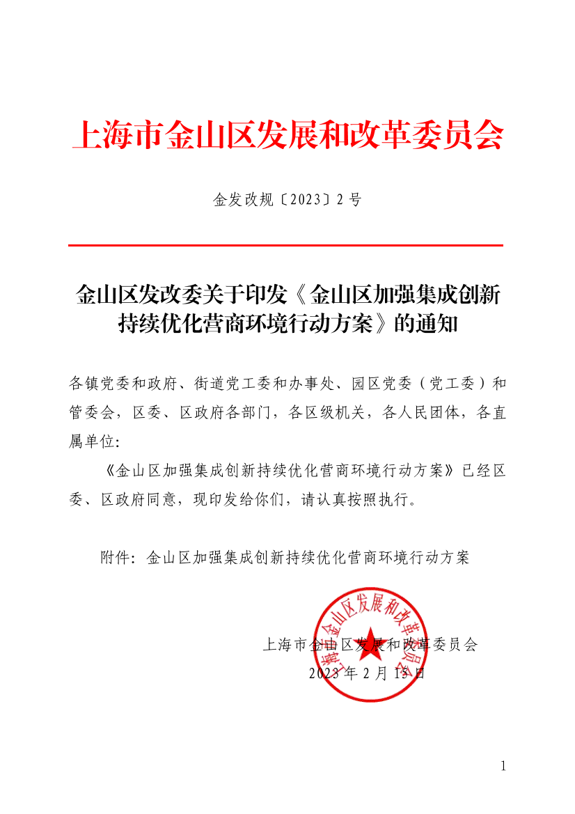 金山区发改委关于印发《金山区加强集成创新持续优化营商环境行动方案》的通知