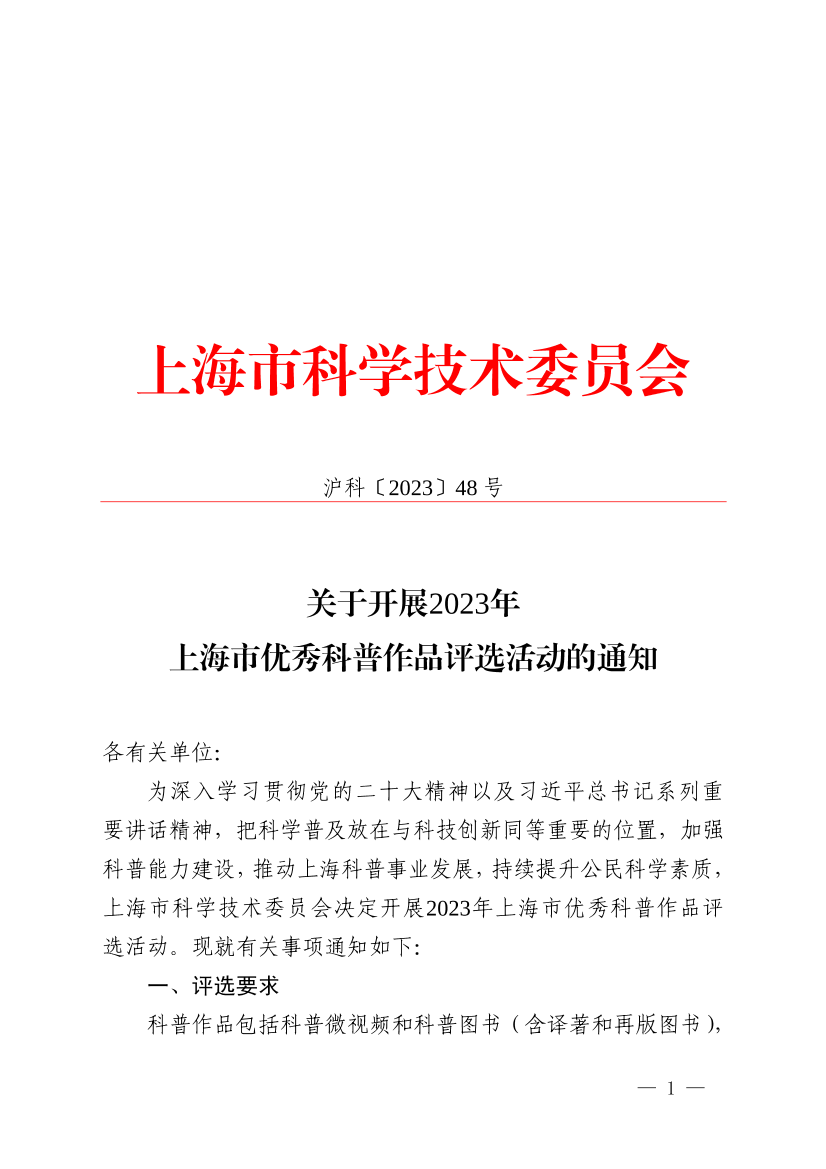 关于开展2023年上海市优秀科普作品评选活动的通知