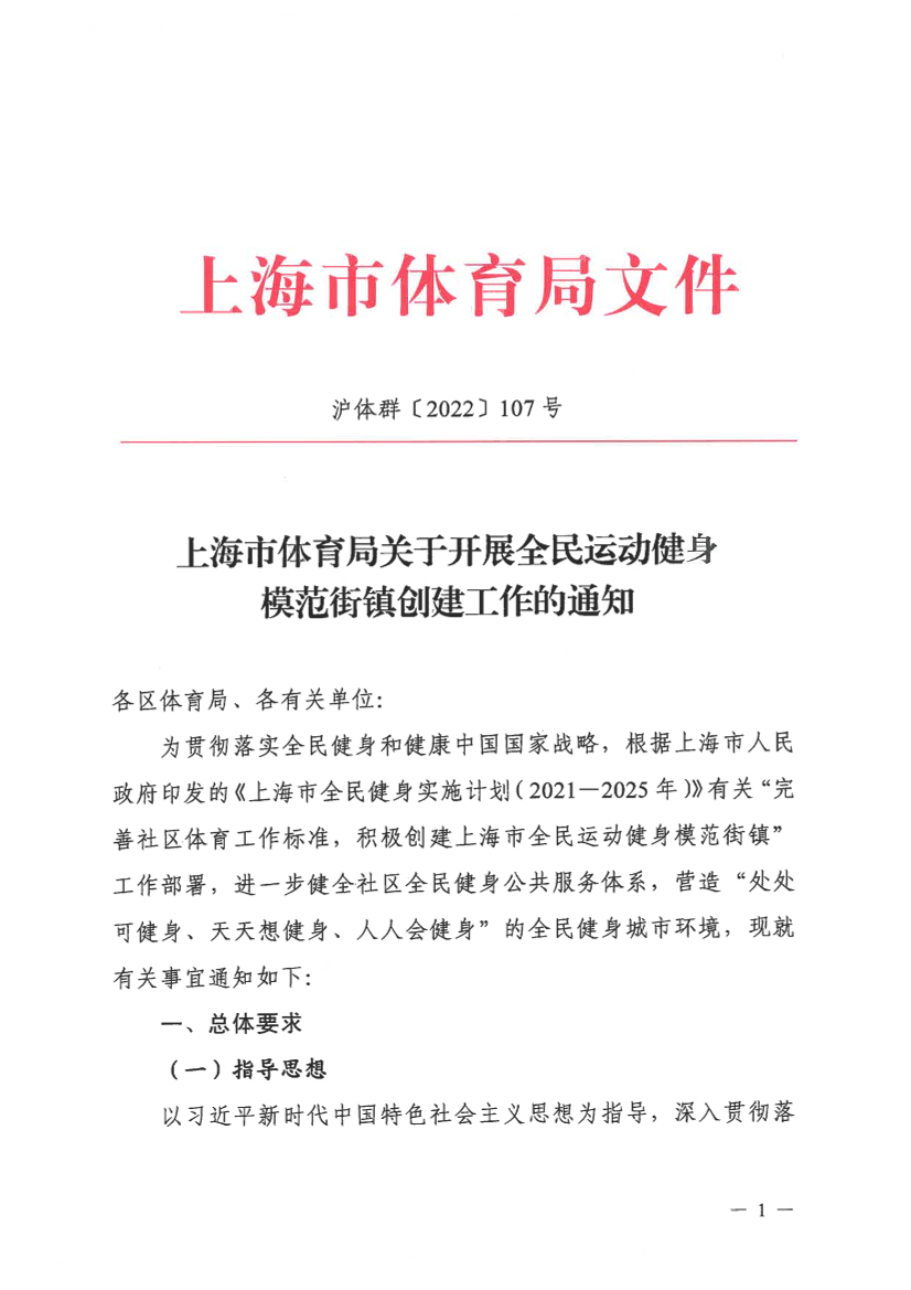 为贯彻落实全民健身和健康中国国家战略,根据上海市人民政府印发的《上海市全民健身实施计划(2021—2025年)》有关“完善社区体育工作标准,积极创建上海市全民运动健身模范街镇”工作部署,进一步健全社区全民健身公共服务体系,营造“处处可健身、天天想健身、人人会健身”的全民健身城市环境,现就有关事宜通知如下: