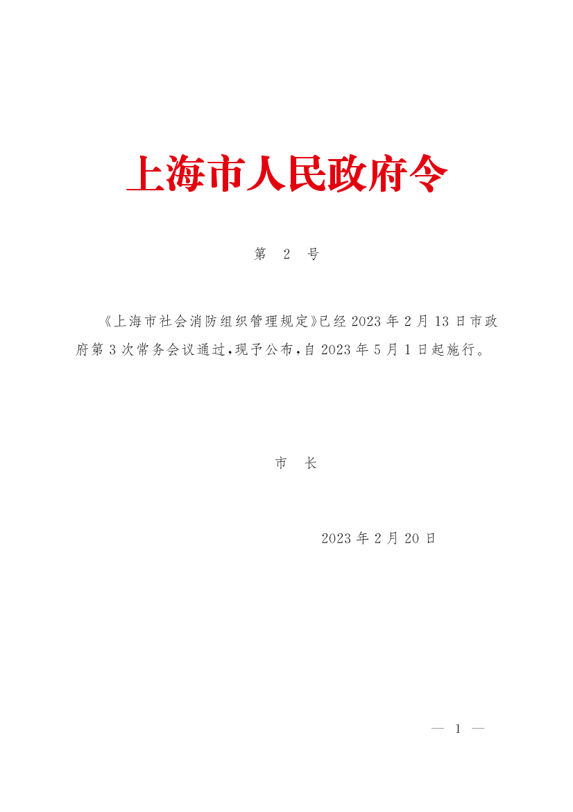 《上海市社会消防组织管理规定》已经2023年2月13日市政府第3次常务会议通过,现予公布,自2023年5月1日起施行。