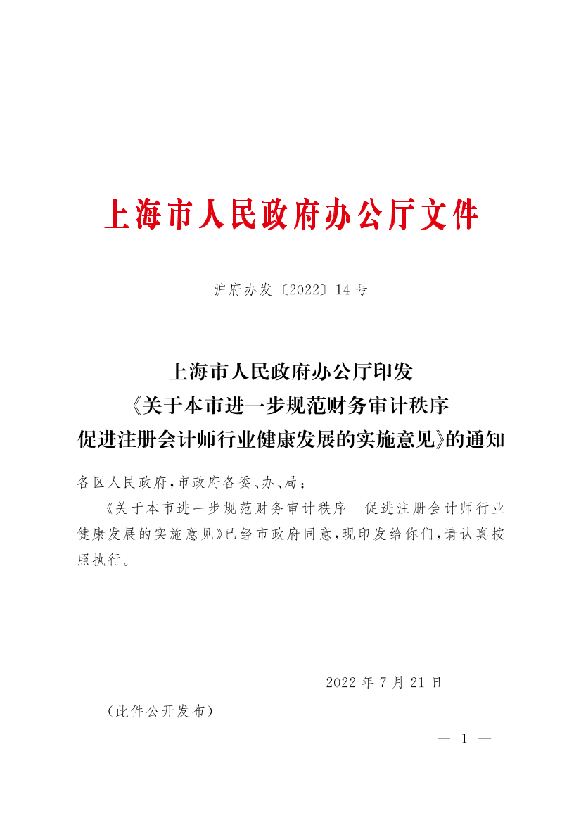 上海市人民政府办公厅印发《关于本市进一步规范财务审计秩序促进注册会计师行业健康发展的实施意见》的通知