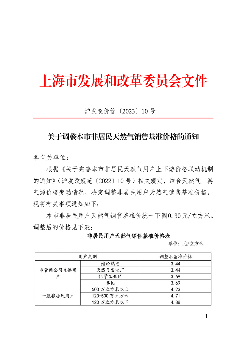 根据《关于完善本市非居民天然气用户上下游价格联动机制的通知》(沪发改规范〔2022〕10号)相关规定,结合天然气上游气源价格变动情况,决定调整非居民用户天然气销售基准价格,现将有关事项通知如下: