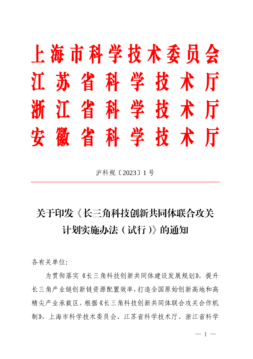 为贯彻落实《长三角科技创新共同体建设发展规划》,提升长三角产业链创新链资源配置效率,打造全国原始创新高地和高精尖产业承载区,根据《长三角科技创新共同体联合攻关合作机制》,上海市科学技术委员会、江苏省科学技术厅、浙江省科学技术厅、安徽省科学技术厅联合制定《长三角科技创新共同体联合攻关计划实施办法(试行)》,现予以印发,请认真推进落实。