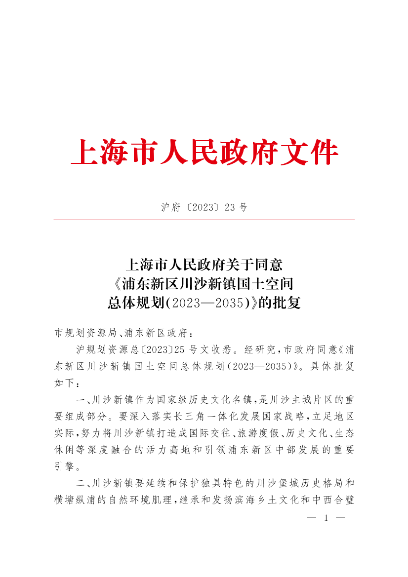 沪规划资源总〔2023〕25号文收悉。经研究,市政府同意《浦东新区川沙新镇国土空间总体规划(2023—2035)》。具体批复如下: