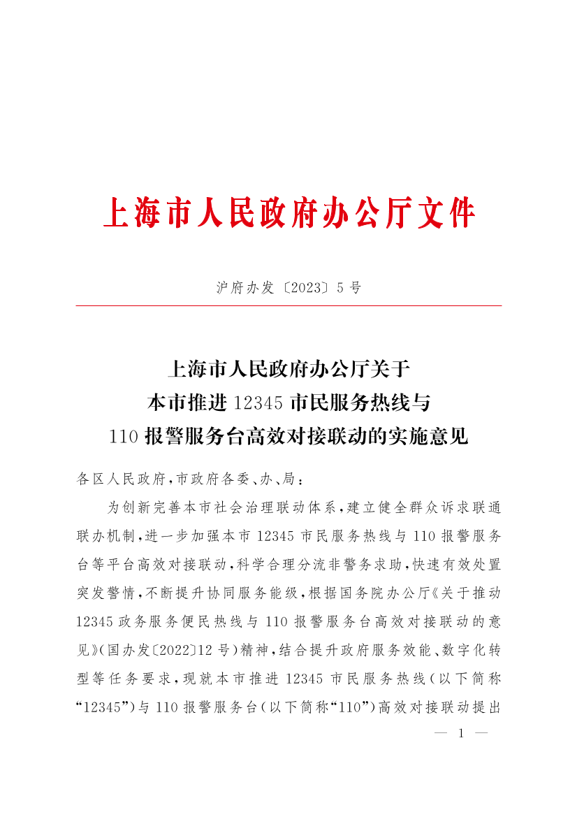 为创新完善本市社会治理联动体系,建立健全群众诉求联通联办机制,进一步加强本市12345市民服务热线与110报警服务台等平台高效对接联动,科学合理分流非警务求助,快速有效处置突发警情,不断提升协同服务能级,根据国务院办公厅《关于推动12345政务服务便民热线与110报警服务台高效对接联动的意见》(国办发〔2022〕12号)精神,结合提升政府服务效能、数字化转型等任务要求,现就本市推进12345市民服务热线(以下简称“12345”)与110报警服务台(以下简称“110”)高效对接联动提出实施意见如下: