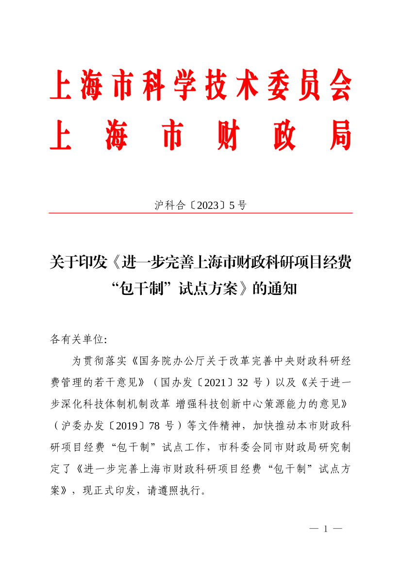 关于印发《进一步完善上海市财政科研项目经费“包干制”试点方案》的通知