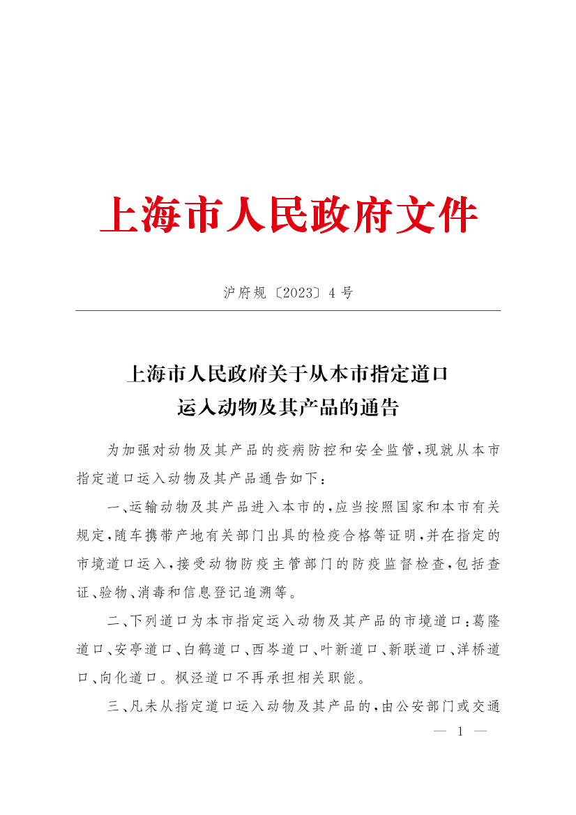 二、下列道口为本市指定运入动物及其产品的市境道口:葛隆道口、安亭道口、白鹤道口、西岑道口、叶新道口、新联道口、洋桥道口、向化道口。枫泾道口不再承担相关职能。