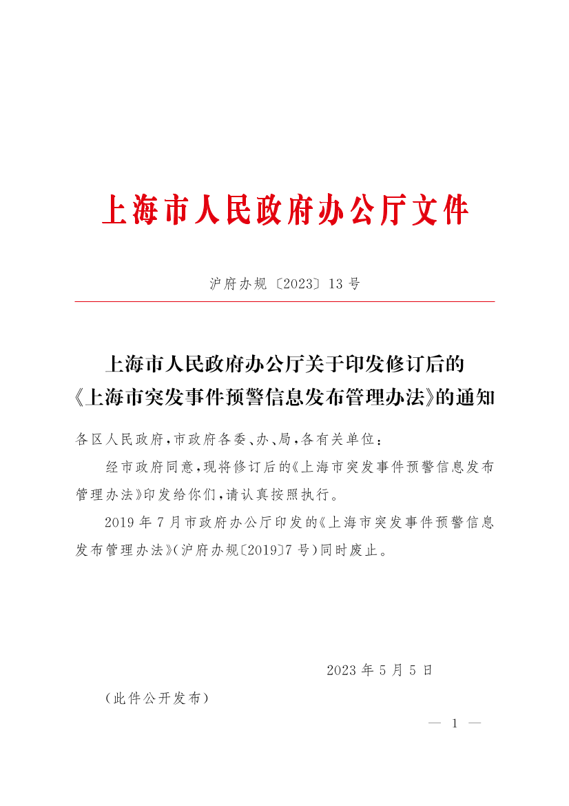 2019年7月市政府办公厅印发的《上海市突发事件预警信息发布管理办法》(沪府办规〔2019〕7号)同时废止。