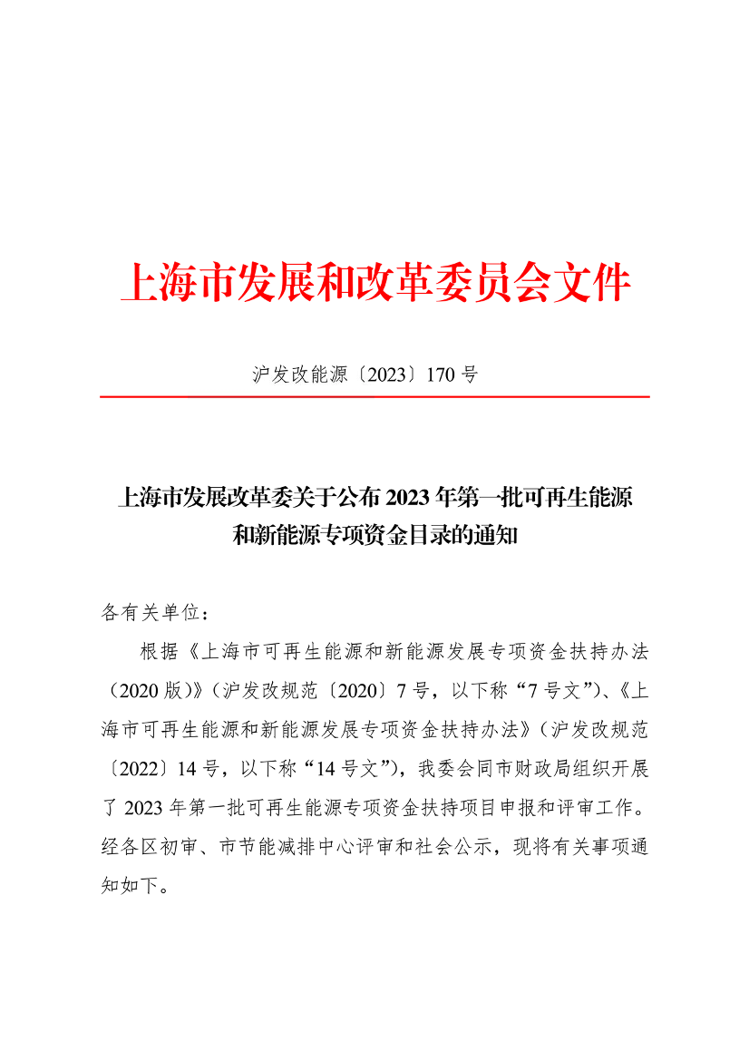 根据《上海市可再生能源和新能源发展专项资金扶持办法(2020版)》(沪发改规范〔2020〕7号,以下称“7号文”)、《上海市可再生能源和新能源发展专项资金扶持办法》(沪发改规范〔2022〕14号,以下称“14号文”),我委会同市财政局组织开展了2023年第一批可再生能源专项资金扶持项目申报和评审工作。经各区初审、市节能减排中心评审和社会公示,现将有关事项通知如下。