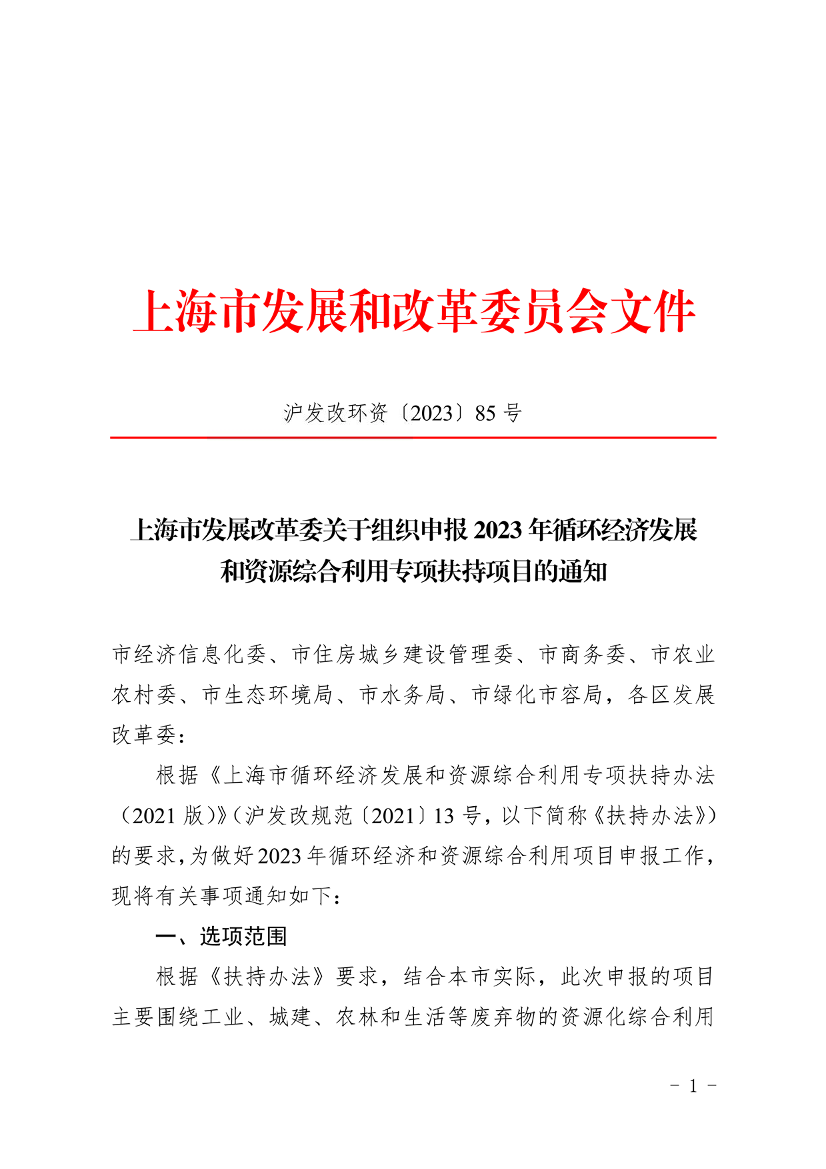 上海市发展改革委关于组织申报2023年循环经济发展和资源综合利用专项扶持项目的通知