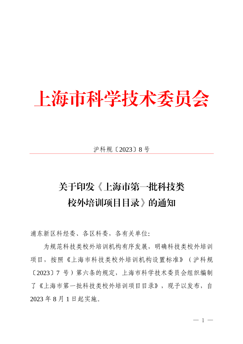 为规范科技类校外培训机构有序发展,明确科技类校外培训项目,按照《上海市科技类校外培训机构设置标准》(沪科规〔2023〕7号)第六条的规定,上海市科学技术委员会组织编制了《上海市第一批科技类校外培训项目目录》,现予以发布,自2023年8月1日起实施。