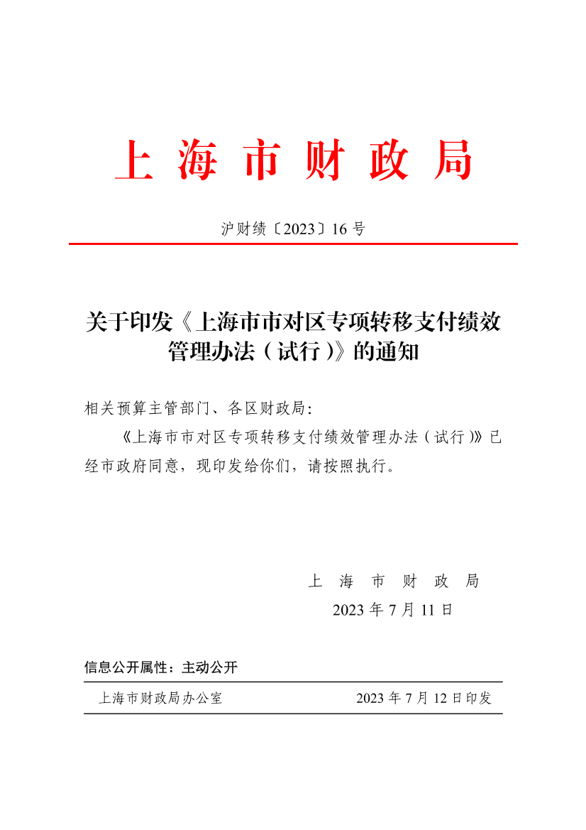 关于印发《上海市市对区专项转移支付绩效管理办法(试行)》的通知