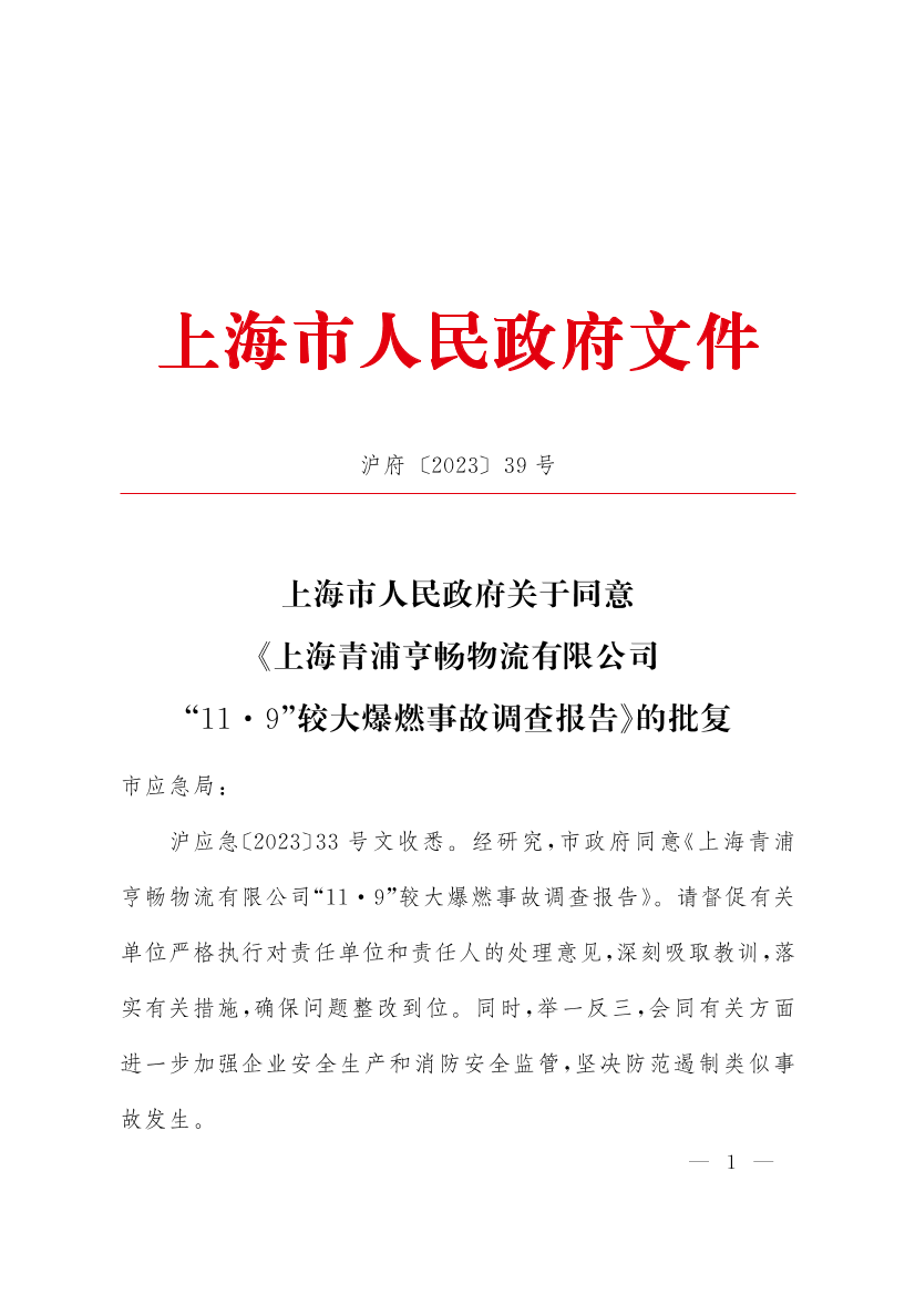 沪应急〔2023〕33号文收悉。经研究,市政府同意《上海青浦亨畅物流有限公司“11·9”较大爆燃事故调查报告》。请督促有关单位严格执行对责任单位和责任人的处理意见,深刻吸取教训,落实有关措施,确保问题整改到位。同时,举一反三,会同有关方面进一步加强企业安全生产和消防安全监管,坚决防范遏制类似事故发生。