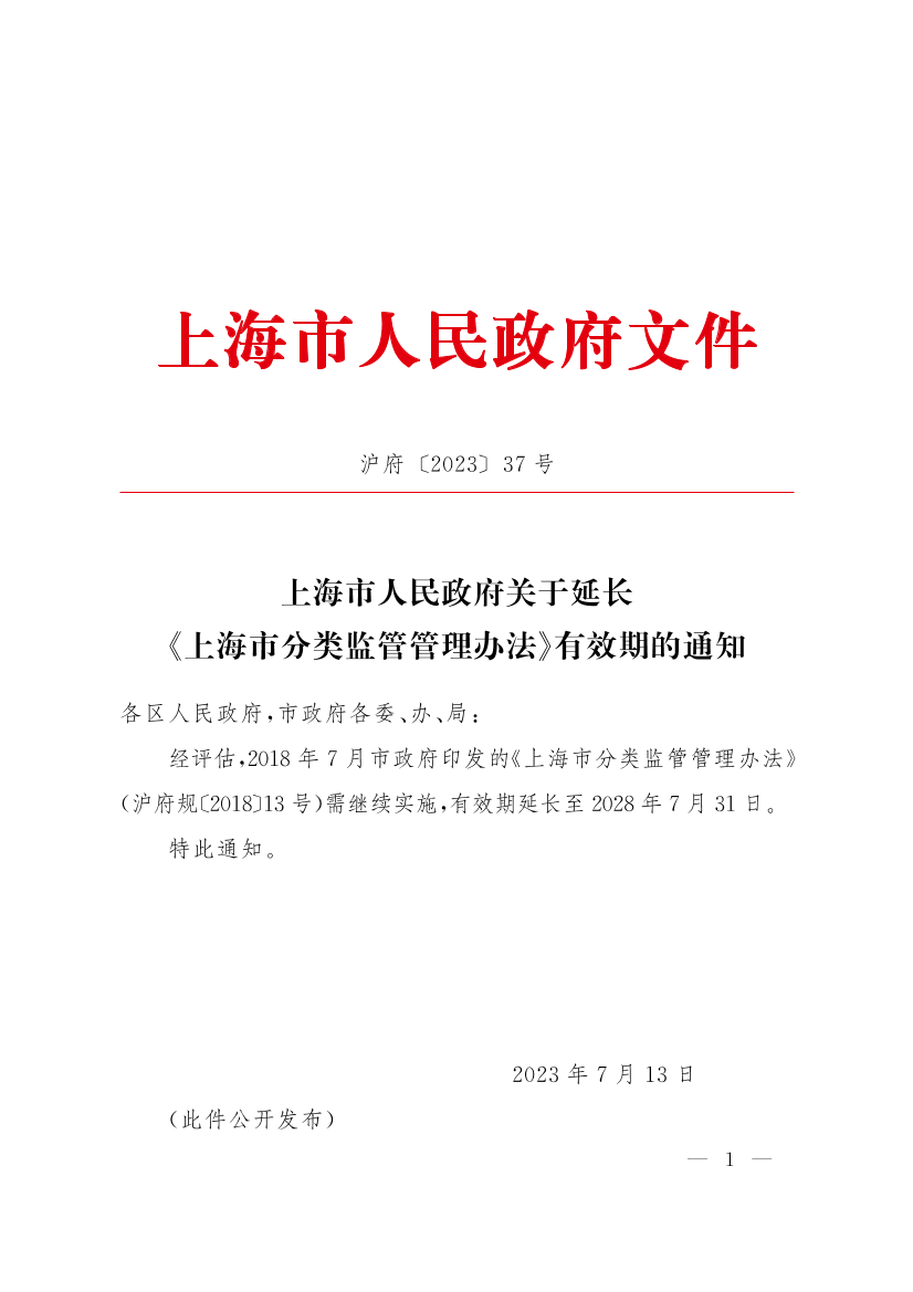 经评估,2018年7月市政府印发的《上海市分类监管管理办法》(沪府规〔2018〕13号)需继续实施,有效期延长至2028年7月31日。