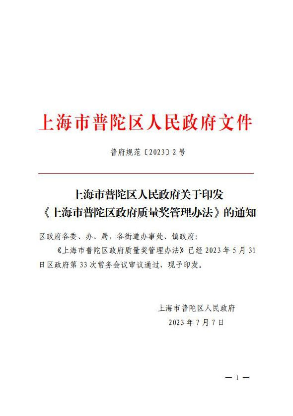 《上海市普陀区政府质量奖管理办法》已经2023年5月31日区政府第33次常务会议审议通过,现予印发。