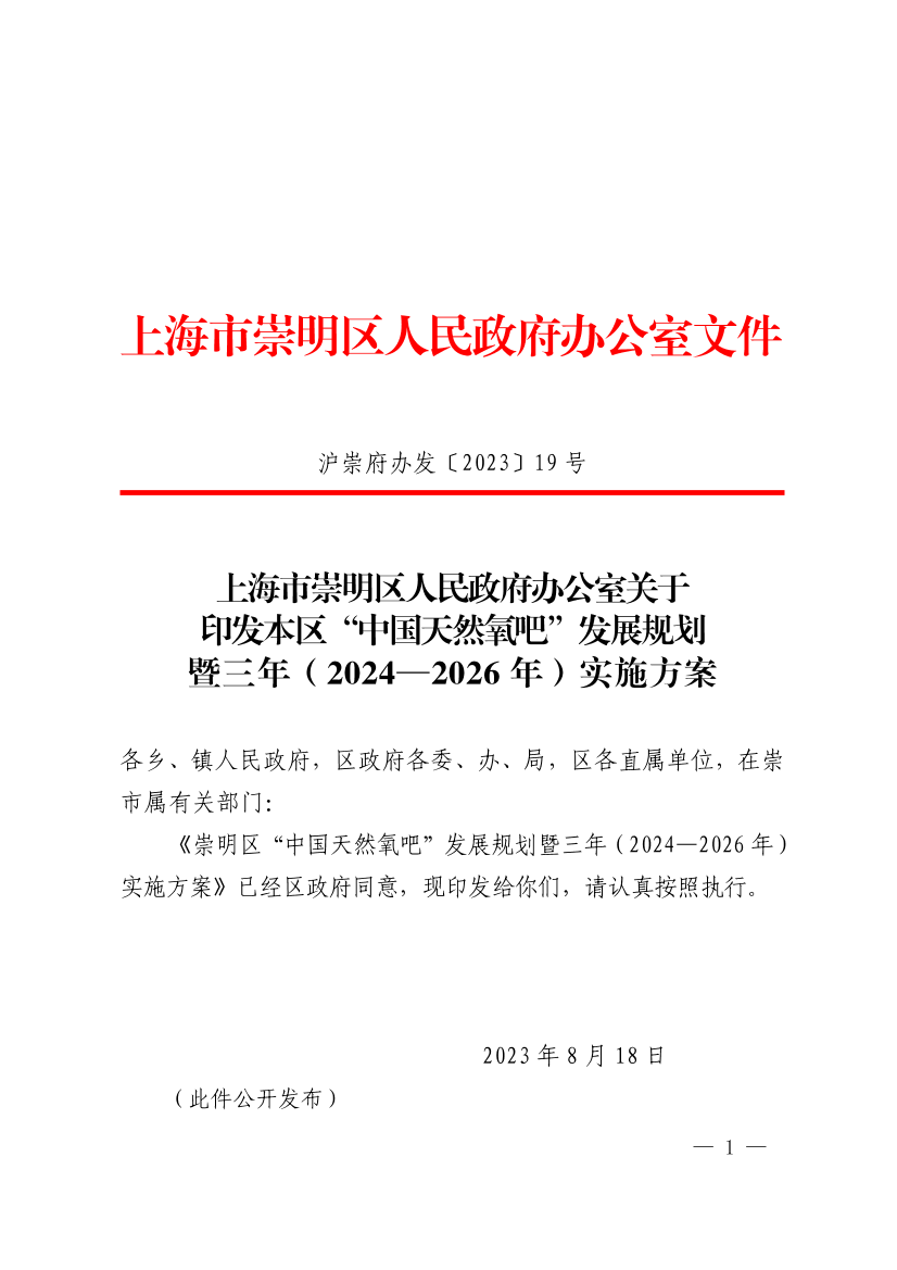 《崇明区“中国天然氧吧”发展规划暨三年(2024—2026年)实施方案》已经区政府同意,现印发给你们,请认真按照执行。
