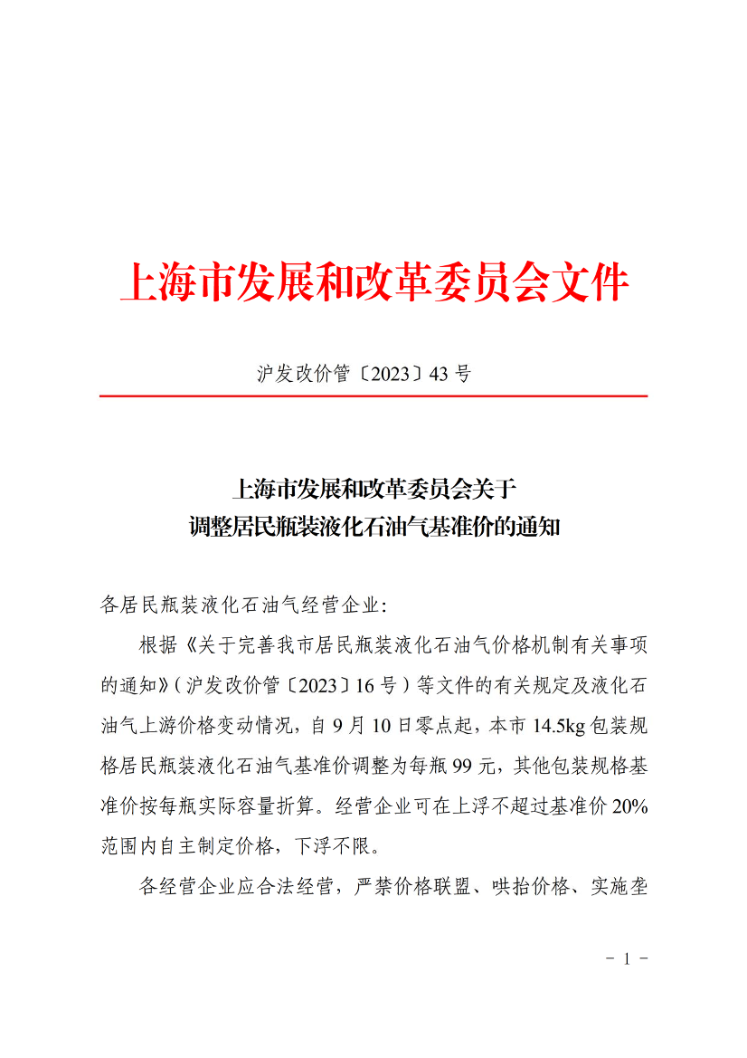 根据《关于完善我市居民瓶装液化石油气价格机制有关事项的通知》(沪发改价管〔2023〕16号)等文件的有关规定及液化石油气上游价格变动情况,自9月10日零点起,本市14.5kg包装规格居民瓶装液化石油气基准价调整为每瓶99元,其他包装规格基准价按每瓶实际容量折算。经营企业可在上浮不超过基准价20%范围内自主制定价格,下浮不限。