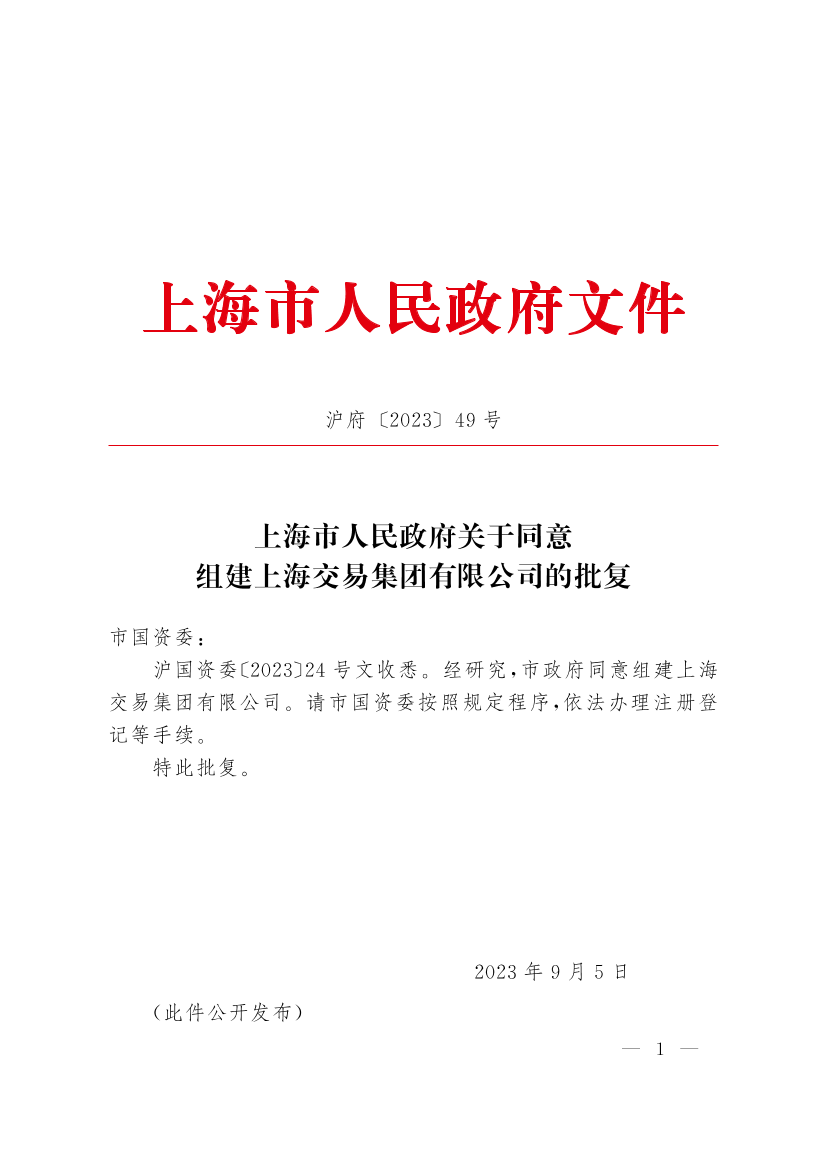 沪国资委〔2023〕24号文收悉。经研究,市政府同意组建上海交易集团有限公司。请市国资委按照规定程序,依法办理注册登记等手续。