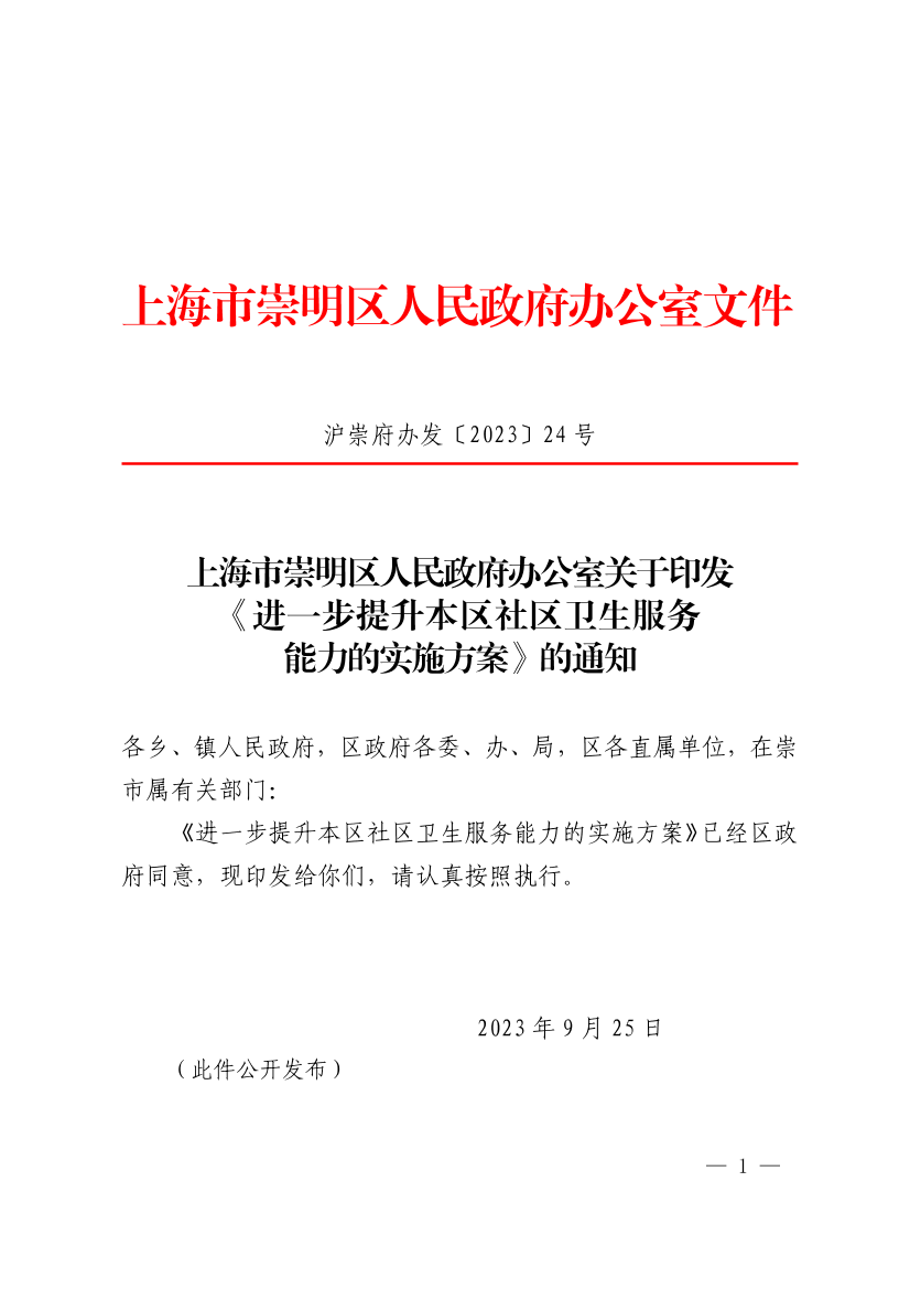 为进一步提升本区社区卫生服务能力,完善分级诊疗体系,充分发挥社区卫生服务在健康服务体系中的基础性作用,增强人民群众健康获得感,根据沪府办发〔2023〕7号《进一步提升本市社区卫生服务能力的实施方案》《崇明区卫生健康发展“十四五”规划》和《健康崇明行动方案(2019—2030年)》,制定本区实施方案。