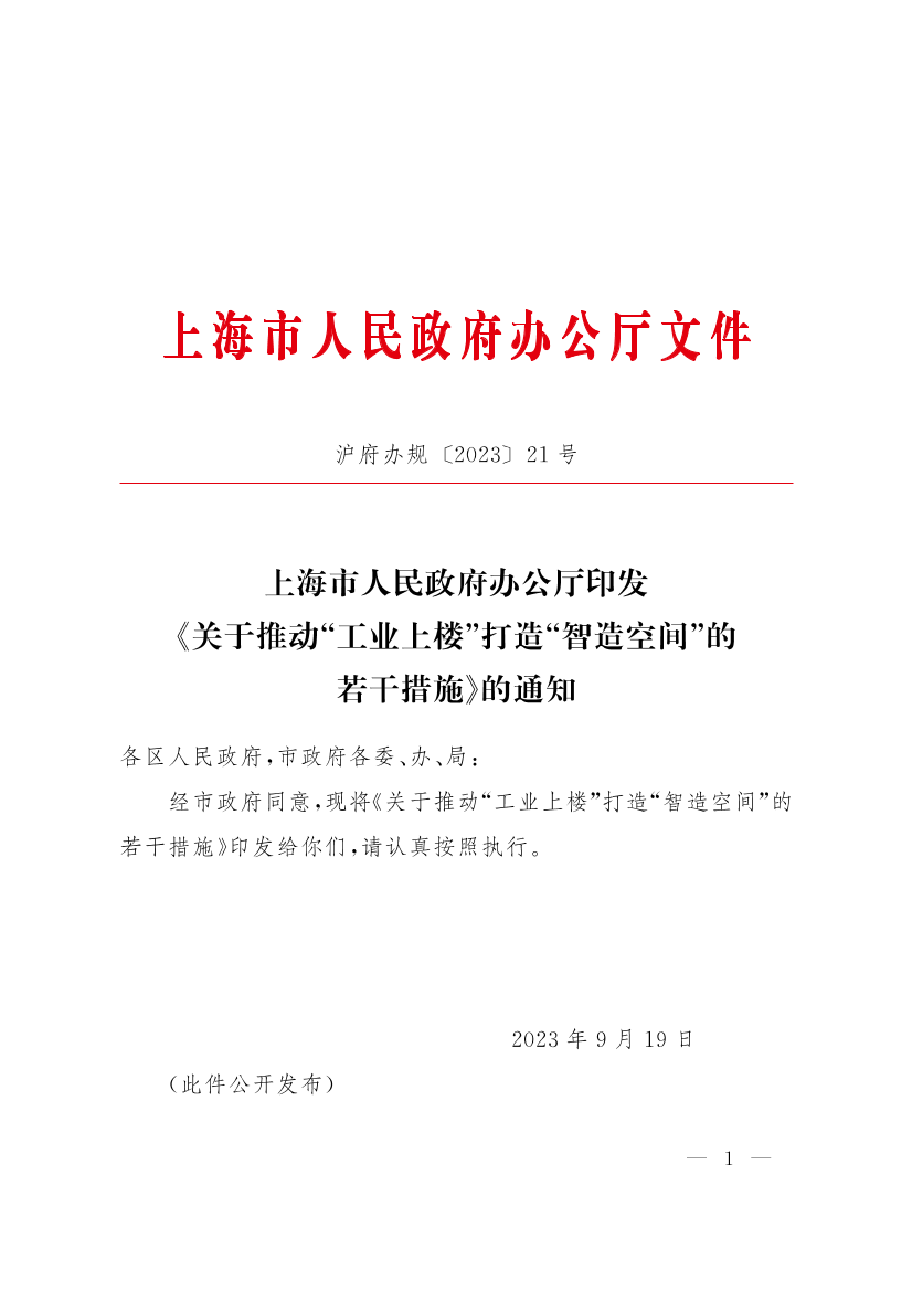 上海市人民政府办公厅印发《关于推动“工业上楼”打造“智造空间”的若干措施》的通知