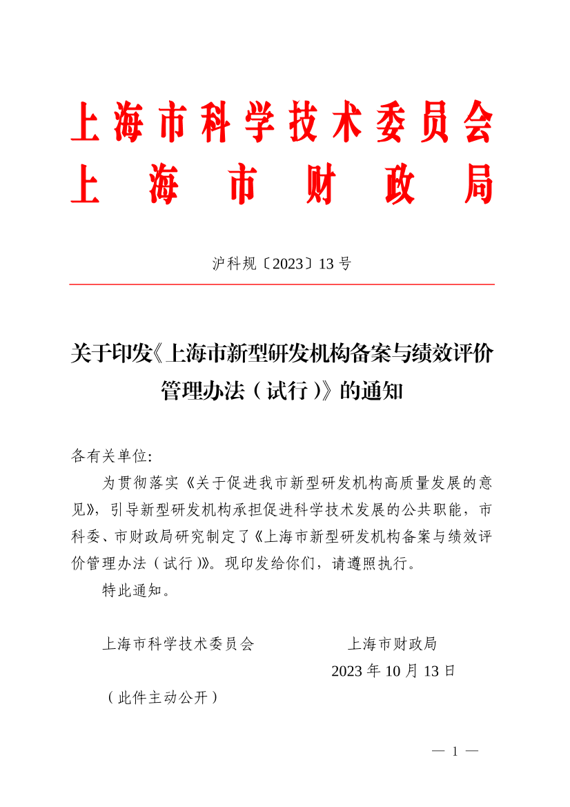 关于印发《上海市新型研发机构备案与绩效评价管理办法(试行)》的通知