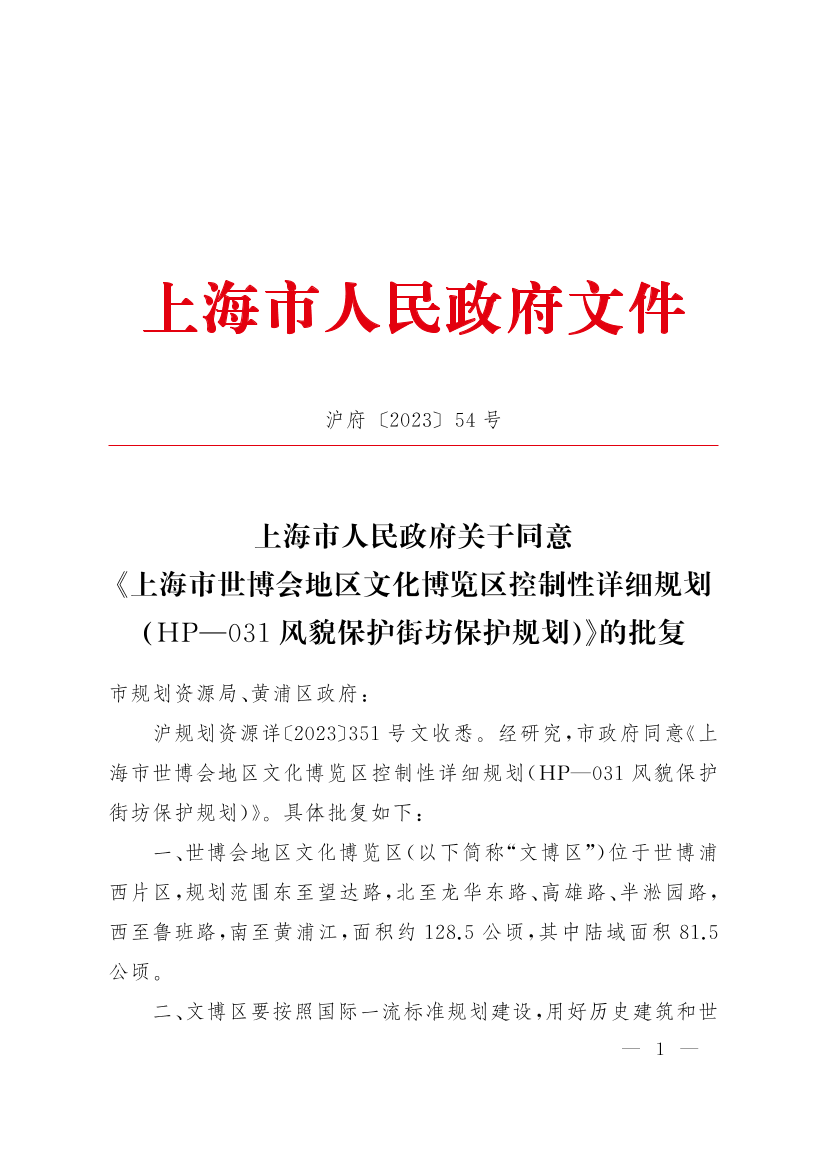 沪规划资源详〔2023〕351号文收悉。经研究,市政府同意《上海市世博会地区文化博览区控制性详细规划(HP—031风貌保护街坊保护规划)》。具体批复如下:
