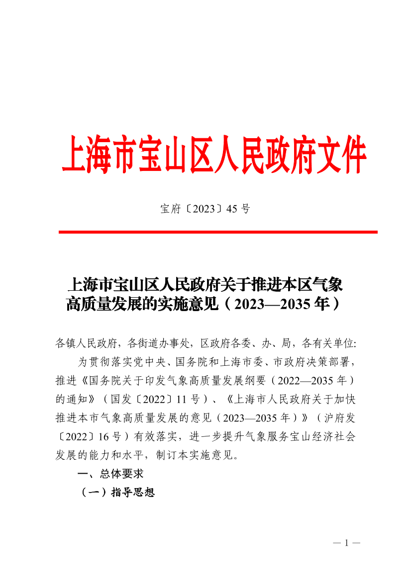 为贯彻落实党中央、国务院和上海市委、市政府决策部署,推进《国务院关于印发气象高质量发展纲要(2022—2035年)的通知》(国发〔2022〕11号)、《上海市人民政府关于加快推进本市气象高质量发展的意见(2023—2035年)》(沪府发〔2022〕16号)有效落实,进一步提升气象服务宝山经济社会发展的能力和水平,制订本实施意见。