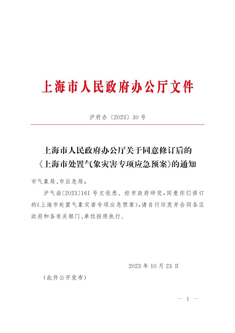 沪气函〔2023〕161号文收悉。经市政府研究,同意你们修订的《上海市处置气象灾害专项应急预案》,请自行印发并会同各区政府和各有关部门、单位按照执行。