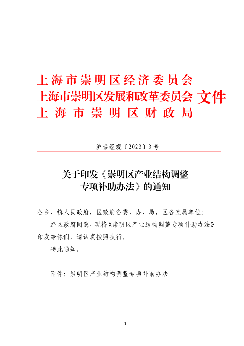 关于印发《崇明区产业结构调整专项补助办法》的通知