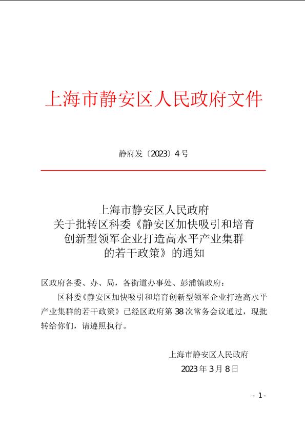 区科委《静安区加快吸引和培育创新型领军企业打造高水平产业集群的若干政策》已经区政府第38次常务会议通过,现批转给你们,请遵照执行。