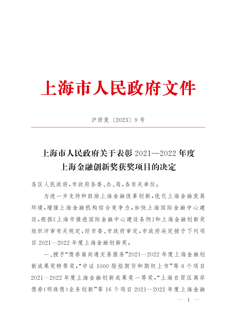 上海市人民政府关于表彰2021—2022年度上海金融创新奖获奖项目的决定