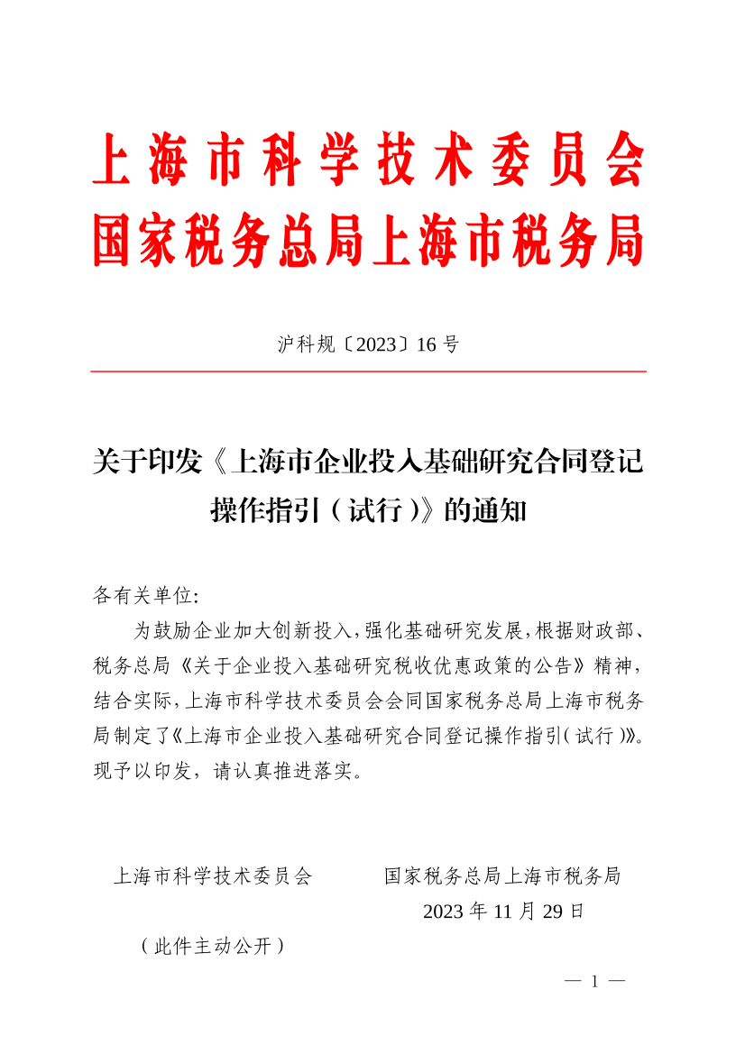 为鼓励企业加大创新投入,强化基础研究发展,根据财政部、税务总局《关于企业投入基础研究税收优惠政策的公告》精神,结合实际,上海市科学技术委员会会同国家税务总局上海市税务局制定了《上海市企业投入基础研究合同登记操作指引(试行)》。现予以印发,请认真推进落实。