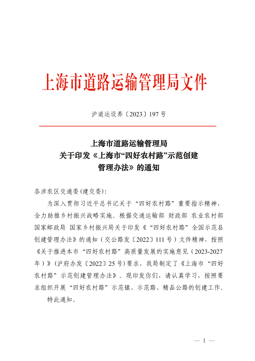 为深入贯彻习近平总书记关于“四好农村路”重要指示精神,全力助推乡村振兴战略实施。根据交通运输部 财政部 农业农村部 国家邮政局 国家乡村振兴局关于印发《“四好农村路”全国示范县创建管理办法》的通知(交公路发〔2022〕111号)文件精神,按照《关于推进本市“四好农村路”高质量发展的实施意见(2023-2027年)》(沪府办发〔2022〕25号)要求,我局制定了《上海市“四好农村路”示范创建管理办法》。现印发你们,请认真学习,按照要求组织开展“四好农村路”示范镇、示范路、精品公路的创建工作。