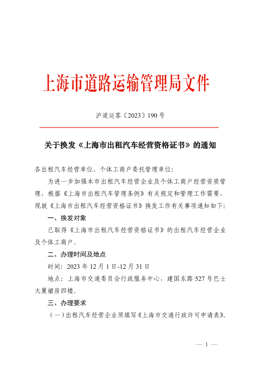 为进一步加强本市出租汽车经营企业及个体工商户经营资质管理,根据《上海市出租汽车管理条例》有关规定和管理工作需要,现就《上海市出租汽车经营资格证书》换发工作有关事项通知如下: