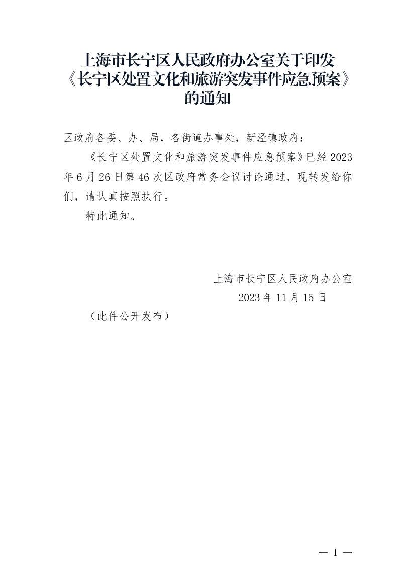 《长宁区处置文化和旅游突发事件应急预案》已经2023年6月26日第46次区政府常务会议讨论通过,现转发给你们,请认真按照执行。