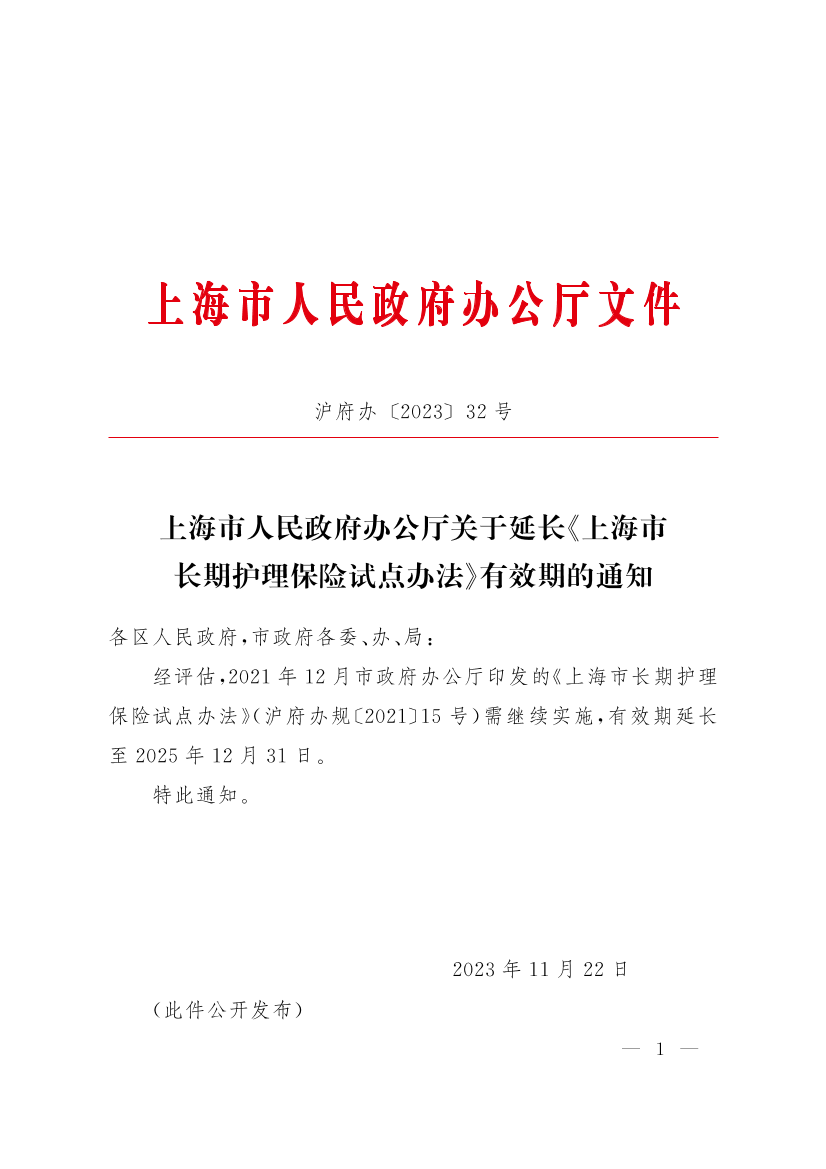 经评估,2021年12月市政府办公厅印发的《上海市长期护理保险试点办法》(沪府办规〔2021〕15号)需继续实施,有效期延长至2025年12月31日。