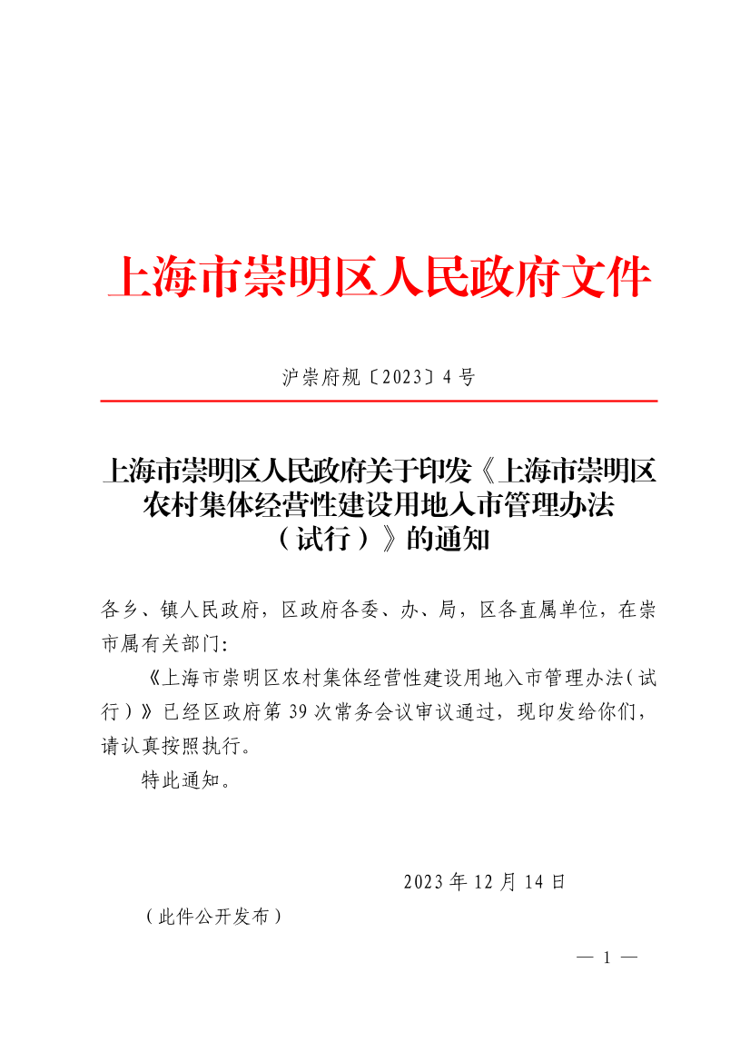 关于印发《上海市崇明区农村集体经营性建设用地入市管理办法(试行)》的通知