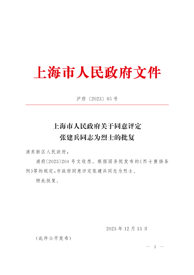 浦府〔2023〕204号文收悉。根据国务院发布的《烈士褒扬条例》等的规定,市政府同意评定张建兵同志为烈士。