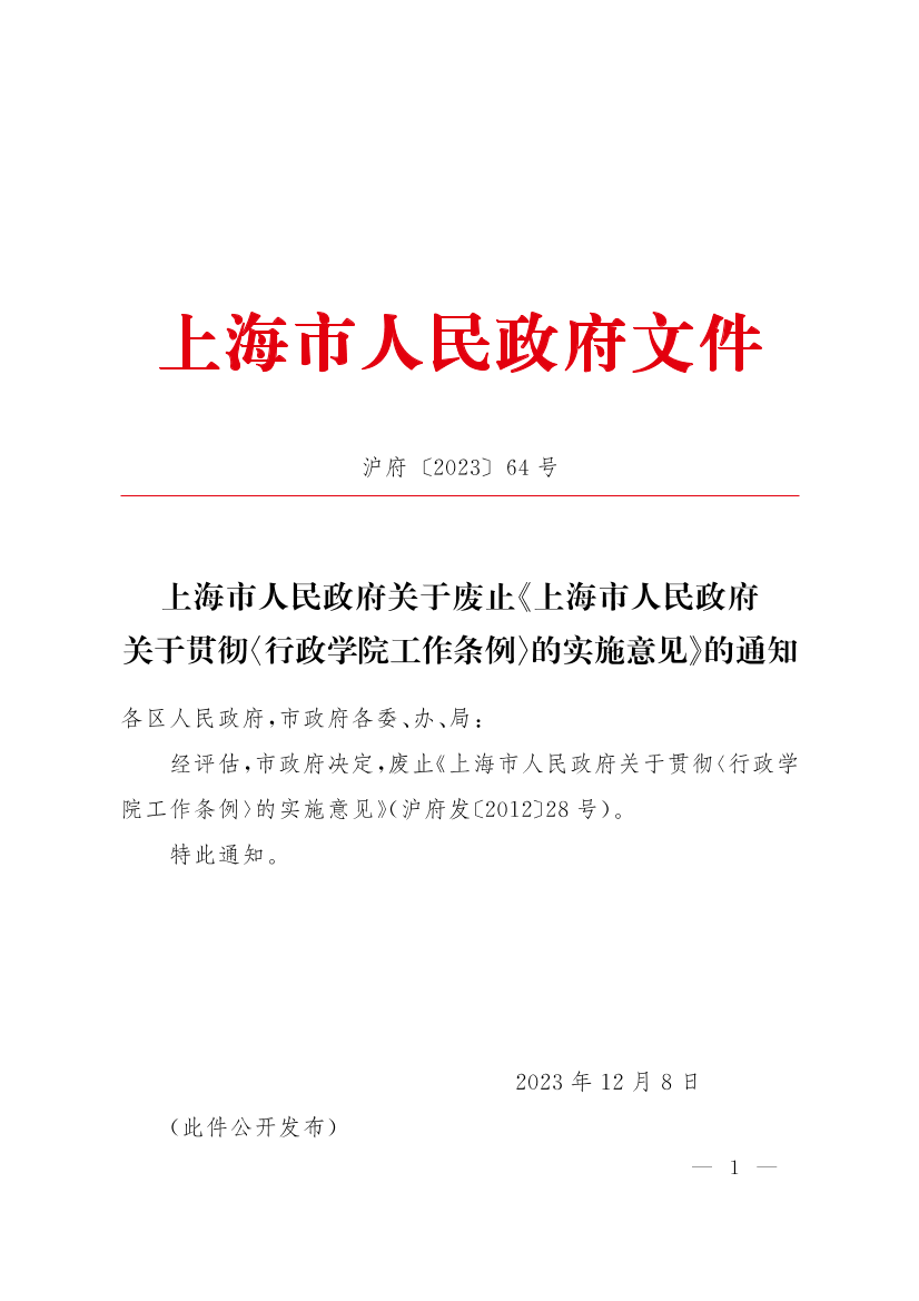 经评估,市政府决定,废止《上海市人民政府关于贯彻〈行政学院工作条例〉的实施意见》(沪府发〔2012〕28号)。