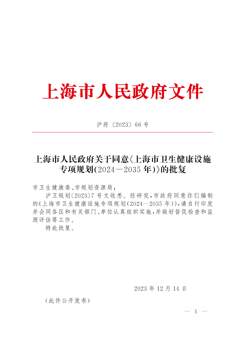 沪卫规划〔2023〕7号文收悉。经研究,市政府同意你们编制的《上海市卫生健康设施专项规划(2024—2035年)》,请自行印发并会同各区和有关部门、单位认真组织实施,并做好督促检查和监测评估等工作。