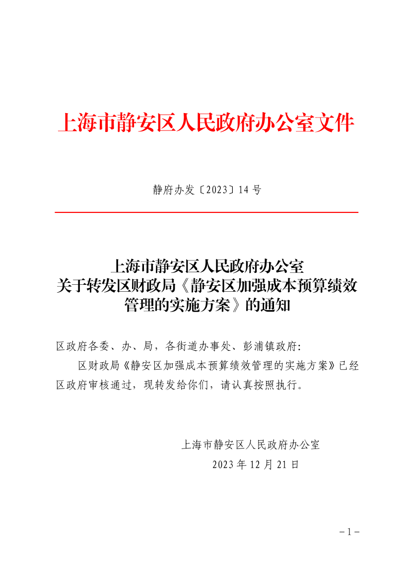 区财政局《静安区加强成本预算绩效管理的实施方案》已经区政府审核通过,现转发给你们,请认真按照执行。